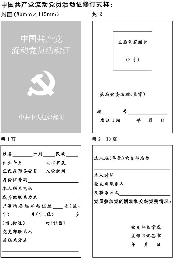 3.《中国共产党流动党员活动证》封面党徽和用字烫金印制。党徽规格为26mm×26mm;“中国共产党”五字用宋体小二号字,“流动党员活动证”七字用宋体二号字,“中共中央组织部制”八字用宋体小三号字。封底用字为宋体五号字,烫金印制。