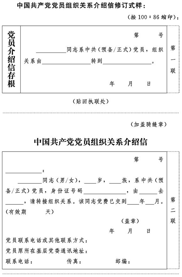 1.《中国共产党党员组织关系介绍信》由省、自治区、直辖市党委组织部,中央直属机关工委、中央国家机关工委组织部,国资委党委、中央各金融机构党委组织部,铁道部政治部,民航总局党委组织部,解放军总政治部组织部,按照中央组织部制定的统一规范式样印制,通过组织系统发放。市(地、州、盟)级党委组织部经上一级党委组织部授权,也可以按照统一规范式样印制。