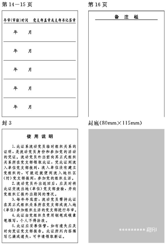 2.中国共产党流动党员活动证》封面和封底颜色为中国红,采用涂塑纸制作,与封二和封三连为一体,规格为80mm×115mm。