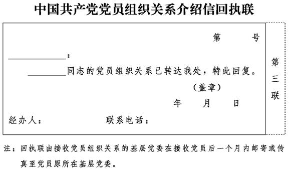 3.回执联仅在转出党员组织关系和最终接收党员组织关系所在党支部的上一级基层党委之间使用,不层层回执。实行回执制度后,在全国范围内转移党员组织关系的权限不变。转出地党组织在收到接收地党组织的回执联后,将其粘贴在存根联的“贴回执联处”备查。